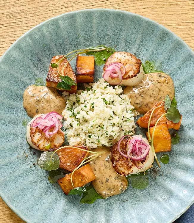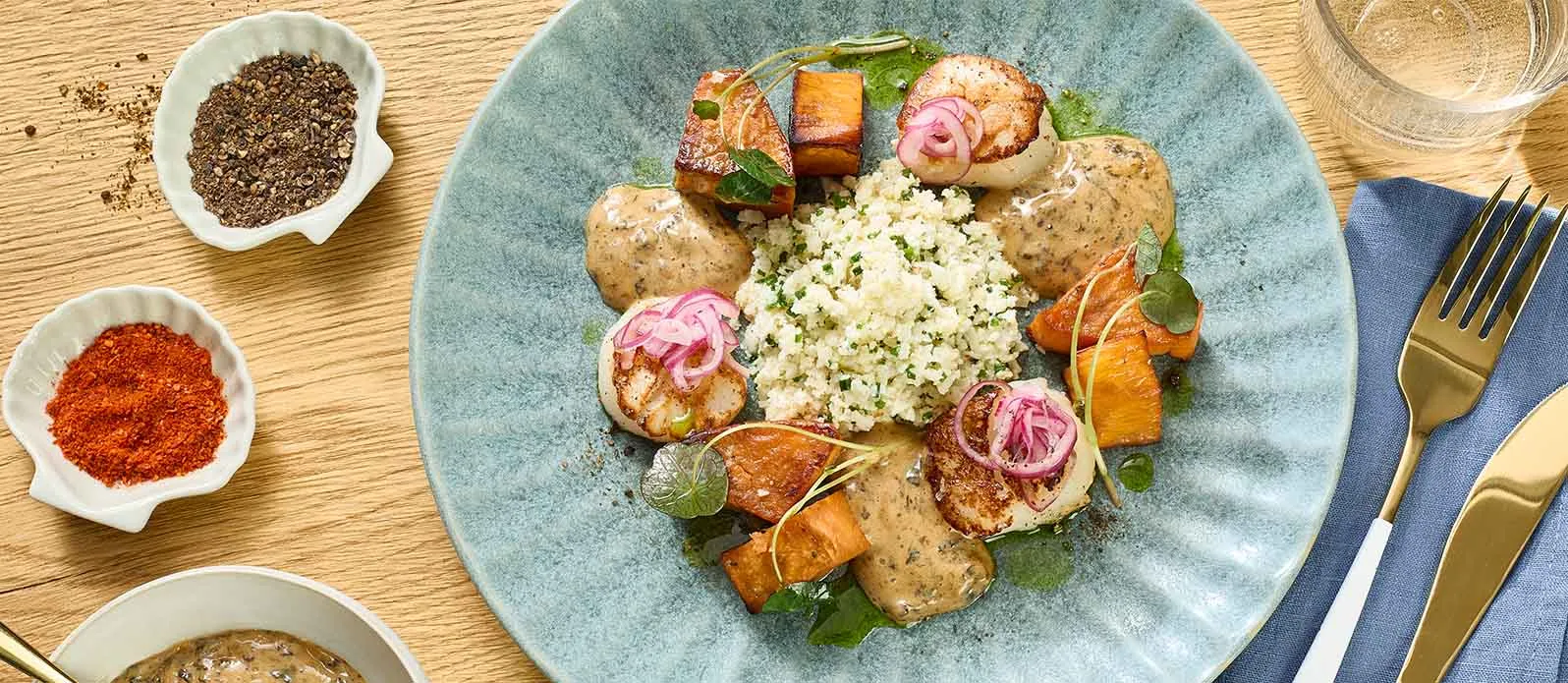 Gebratene Jakobsmuscheln treffen auf „Couscous“ aus Mandeln und Karfiol, geröstete Süßkartoffeln und Nori-Zabaione. Mit Kikkoman salzreduzierter Sojasauce und Kikkoman Würzmittel für Sushi-Reis wird daraus ein begeisterndes Geschmackserlebnis!