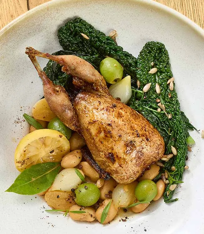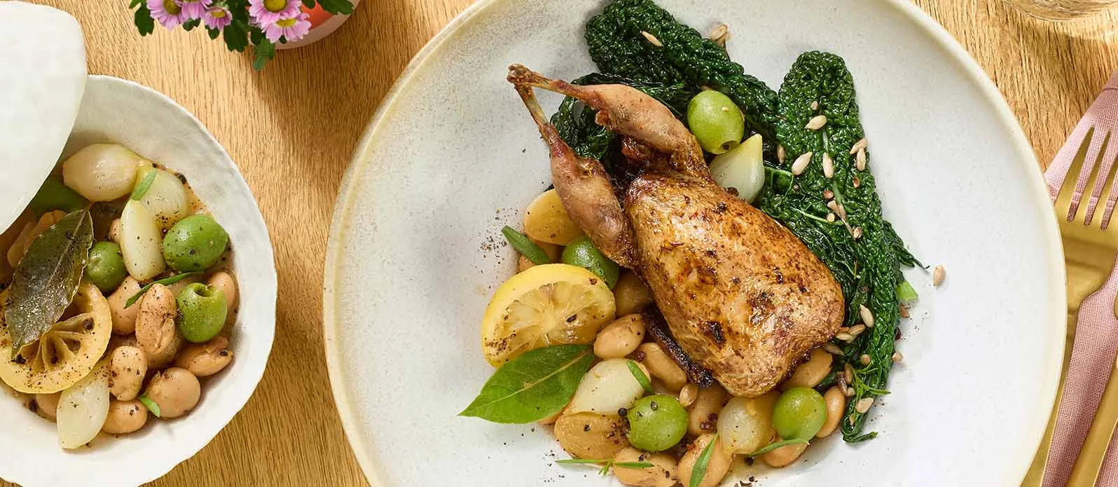Im Ofen gegarte Wachteln treffen auf einen aromatischen Mix aus Zitrone, Schwarzkohl, dicken Bohnen und Oliven. Die Marinade aus Kikkoman Bio-Sojasauce sorgt für besonders zartes Fleisch und rundet die Aromen ab.
