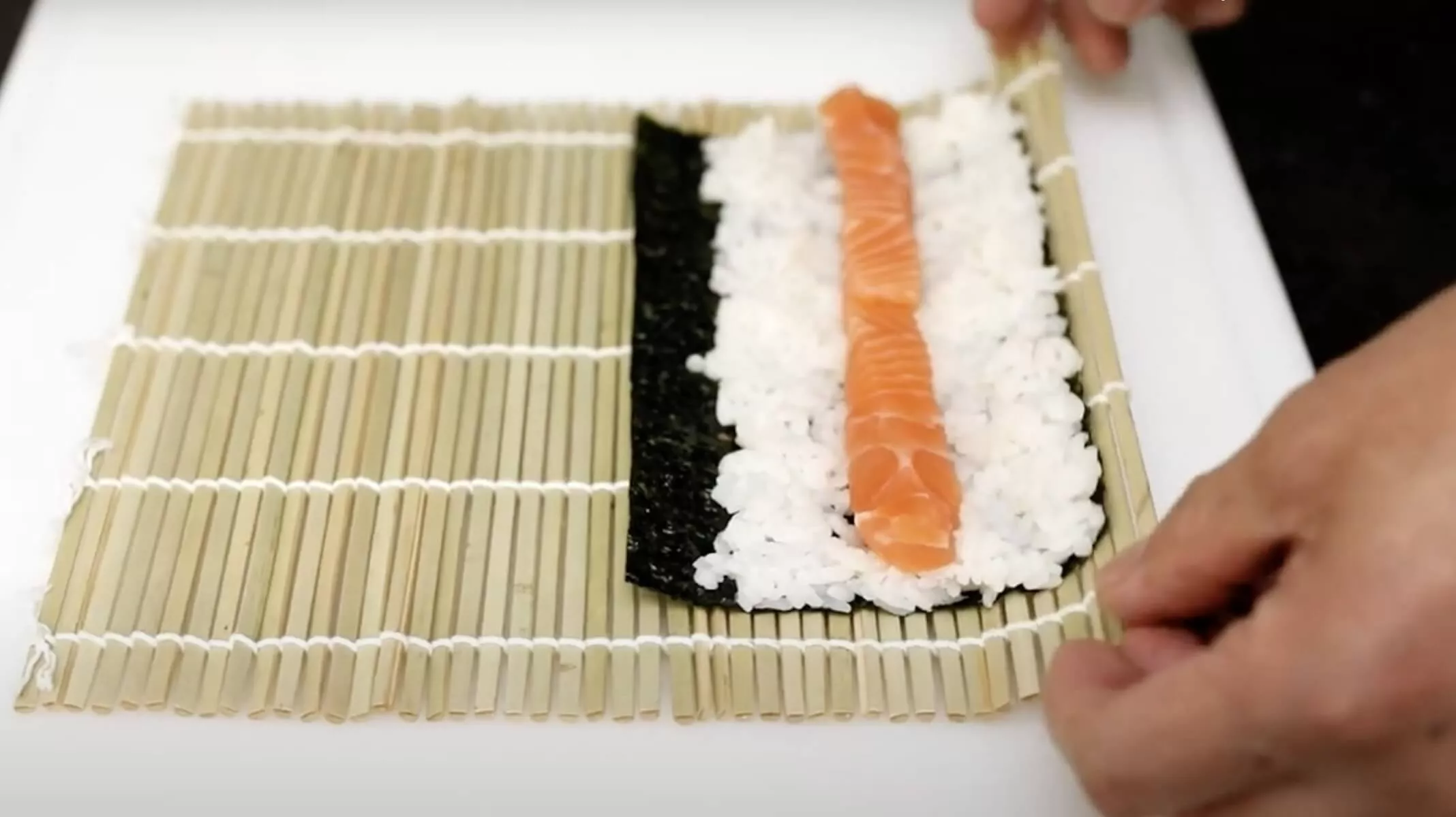 Befeuchte den beim Einrollen die Hände mit Wasser, damit der Reis nicht kleben bleibt.
