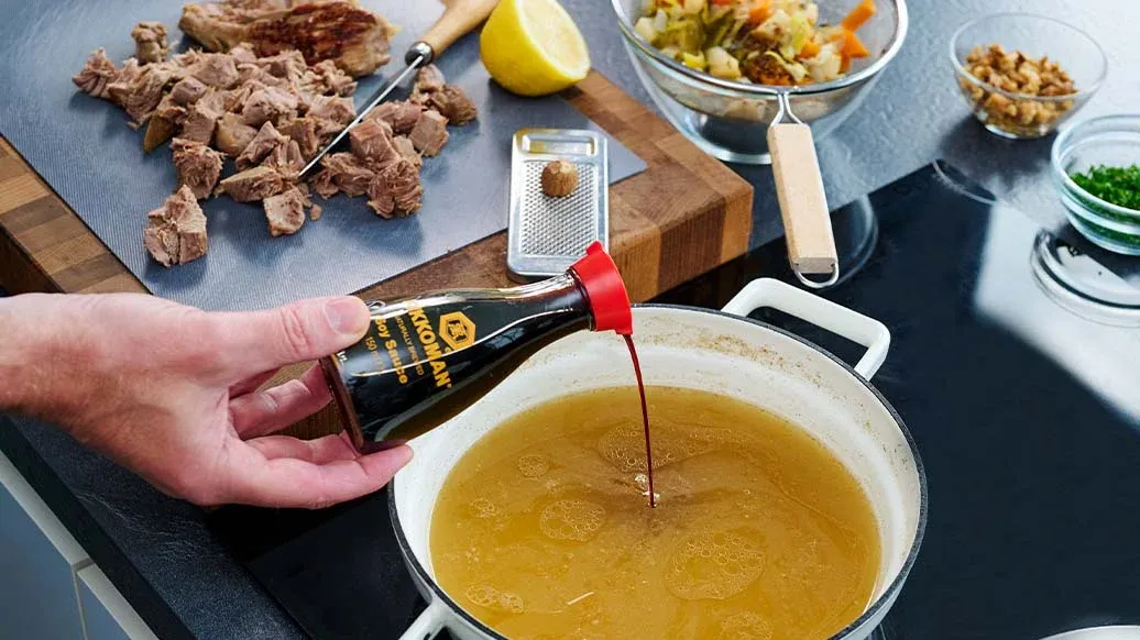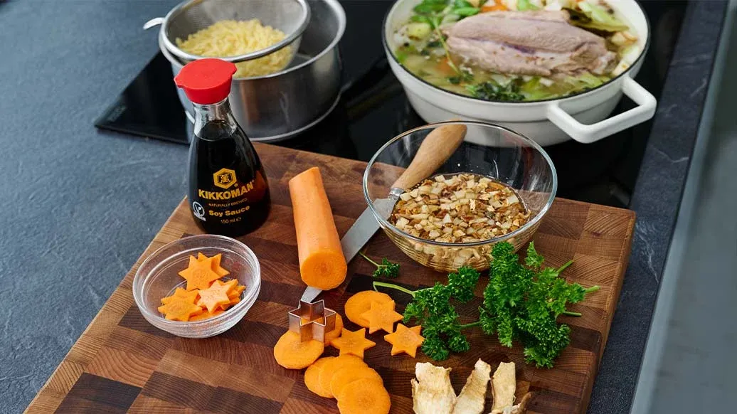 Traditionelle Geflügelbrühe mit Karotte, Sellerie und Lauch trifft auf moderne Gewürznoten mit Kikkoman Sojasauce – serviert mit Nudeln und Pilzen wird daraus ein wärmendes Wintergericht, das man einfach lieben muss.
