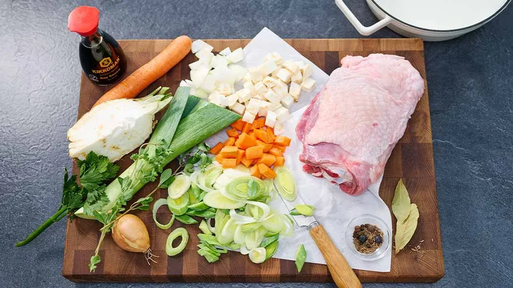 1 Karotte – 1 Stück Wurzelsellerie – 1 kleine Zwiebel – 1 Stange Lauch – 1 Putenkeule, ca. 1,2 kg – 2 Lorbeerblätter – 2 Wacholderbeeren – ¼ schwarze Pfefferkörner – 4 Pimentkörner – ¼ TL Kümmel – 4 Zweige Majoran – 3 EL Kikkoman natürlich gebraute Sojasauce