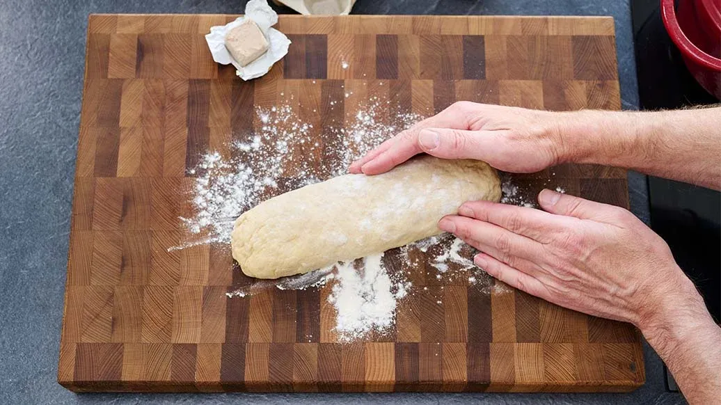 Brot in Würfel schneiden. Mehl, Salz, Milch, zerbröckelte Hefe, Zucker und Eigelb zu einem glatten Teig verarbeiten. Die Brotwürfel untermischen und den Teig abgedeckt an einem warmen Ort ca. 1 Std. gehen lassen. Den Teig zu einer länglichen Rolle formen und über heißem Wasserdampf oder in einem Dämpfeinsatz ca. 20 Min. garen.