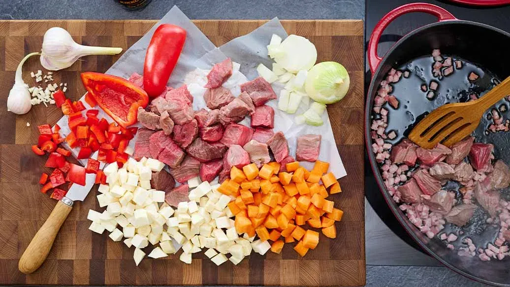 Hirschgulasch und Speck in einem Bräter 8 bis 10 Minuten in heißem Öl anbraten. Paprika, Karotten, Pastinaken und Zwiebeln in Würfel schneiden und Knoblauch fein hacken. Alles zum Fleisch geben und ca. 8 Min. mitbraten.