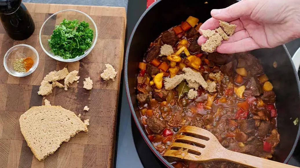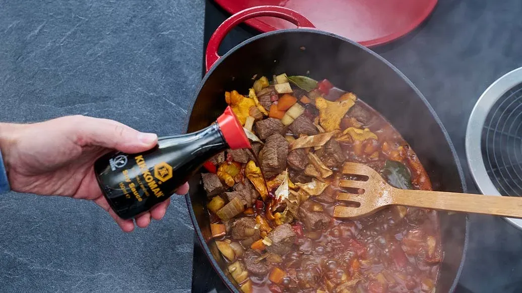 Ein festliches Hirschgulasch mit Pilzen, Wurzelgemüse und Trockenfrüchten, verfeinert mit Rotwein und Kikkoman Sojasauce. Mit Knödeln serviert, wird dieses herzhafte Gericht mit leicht süßlicher Note zum köstlichen Winterschmaus.