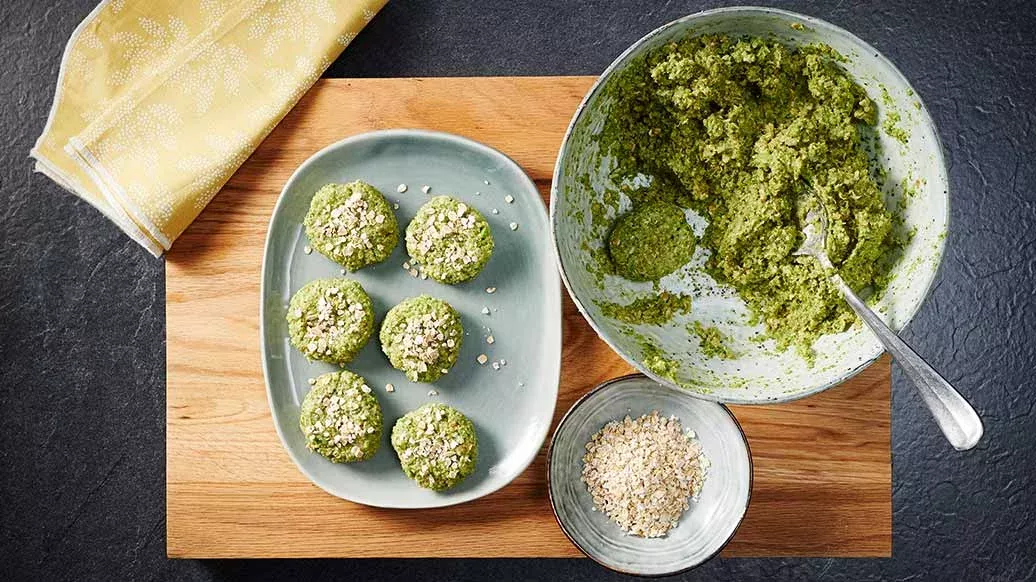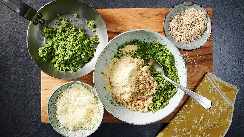 Für die Brokkoli-Fritters den Quinoa nach Packungsanweisung zubereiten. Den Brokkoli mithilfe einer Küchenmaschine fein zerkleinern. Die Schalotte und den Knoblauch in kleine Würfel schneiden. Den Brokkoli in 1 EL erhitztem Öl anbraten, die Schalotte und den Knoblauch dazugeben, alles ca. 15 Minuten braten, herausnehmen und in eine Schüssel geben. Den Quinoa, das Kichererbsenmehl, 30 g Haferflocken und den Käse untermischen und etwas abkühlen lassen.