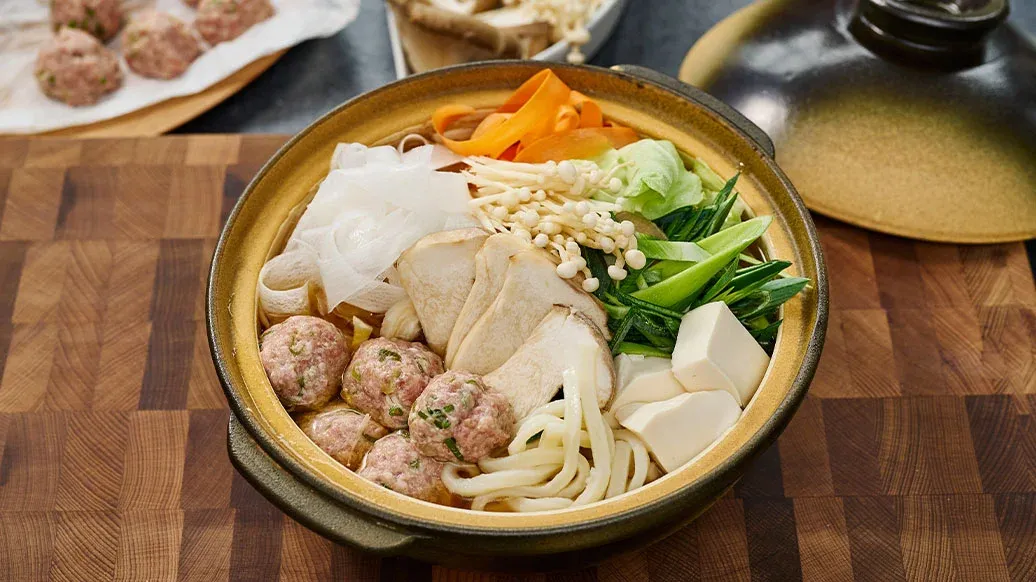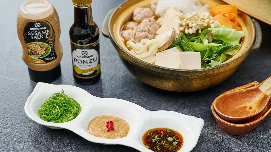 Diese herzhafte Brühe, die einst in Sumo-Schulen zur Kräftigung serviert wurde, enthält reichlich Tofu-Fleischbällchen, frisches Gemüse und Nudeln. Sie wird mit Kikkoman Ramen Suppenbasis und Kikkoman Sesamöl gewürzt und mit Dips serviert.