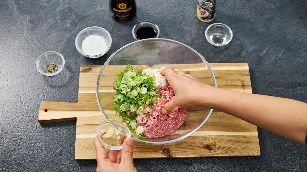 400 g Faschiertes, beliebige Sorte – 100 g Tofu – 1 EL Kikkoman natürlich gebraute Sojasauce – 1 TL Kikkoman süsse Würzsauce Mirin-Art – 2 TL geriebener Ingwer – 3 Frühlingszwiebeln, fein gehackt – 2 EL Maisstärke – Eine Prise schwarzer Pfeffer