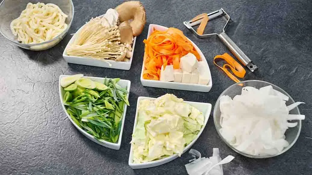 Chinakohl in mundgerechte Stücke, Lauch schräg in Scheiben schneiden. Bei Bedarf die Stiele der Pilze entfernen bzw. die Pilze voneinander trennen. Daikon und Karotten mit einem Schäler in dünne Streifen schneiden. Tofu in 8 Stücke schneiden.