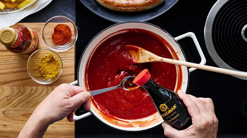 Bratwürste in einer Pfanne in erhitztem Öl von allen Seiten 8 bis 10 Min. goldbraun braten. Die Tomatensauce mit Kikkoman Sojasauce, Currypulver, Paprikapulver und Kikkoman Chilisauce Kimchi abschmecken. Die Bratwürste in Scheiben schneiden, in die Sauce geben, kurz mit erhitzen und mit Pommes frites und Ponzu-Mayo servieren.