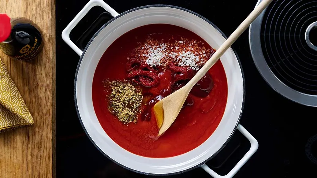 500 g passierte Tomaten (aus der Dose) – 2 EL Tomatenmark – 3 EL Ketchup – 2 TL Honig (alternativ: Ahornsirup oder Kikkoman süße Würzsauce zum Kochen nach Mirin-Art) – 1 TL gekörnte Gemüsebrühe – 2 TL getrocknete Zwiebel, geschnitten (alternativ: 1 kleine Zwiebel, gewürfelt)