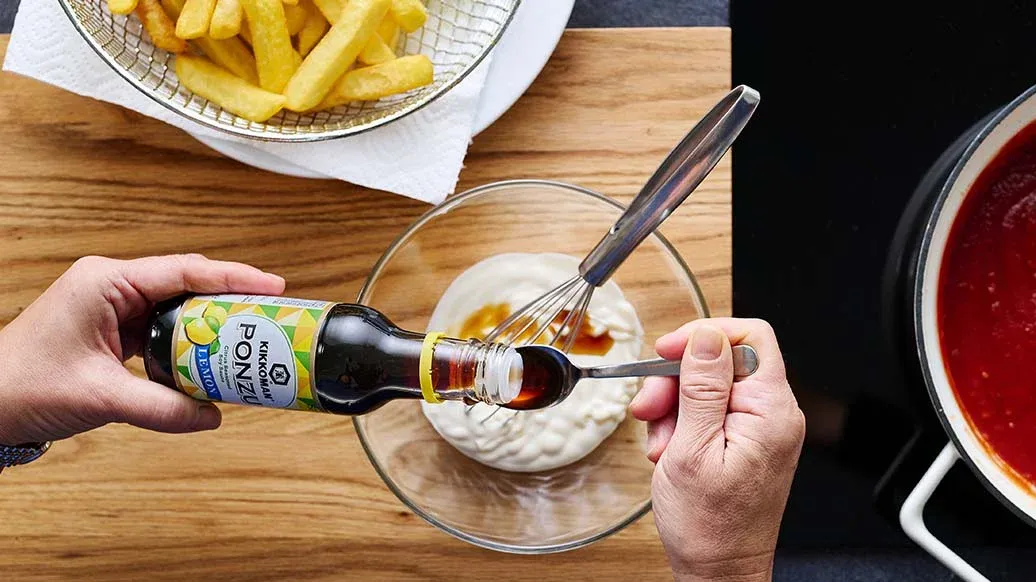 600 g Pommes frites (für die Fritteuse oder den Backofen) – 100 g Mayonnaise – 3 TL Kikkoman Ponzu - Würzsauce mit Sojasauce und Essig, mit Zitronengeschmack