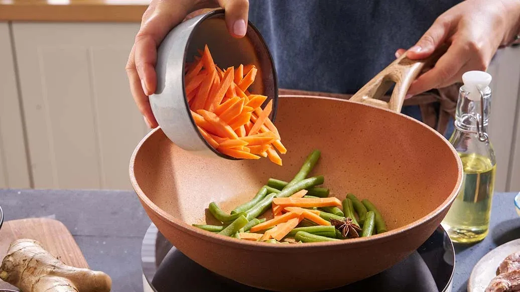 Öl im selben Wok erhitzen, Ingwer, Karotten, Bohnen und Sternanis hinzufügen und 2–3 Minuten unter Rühren anbraten. Wasser hinzufügen und Bohnen etwa 2 Minuten kochen, bis sie weich sind.