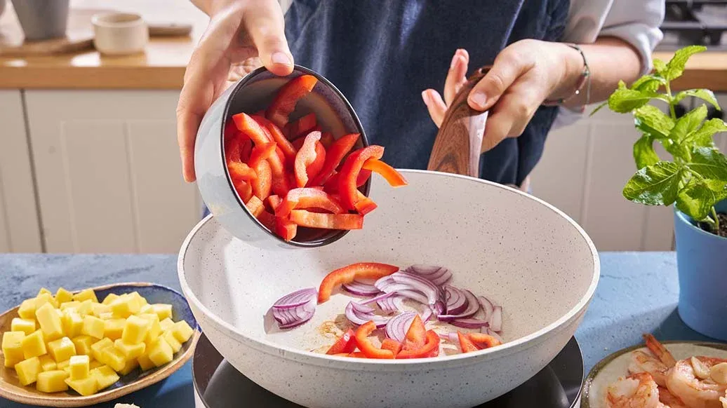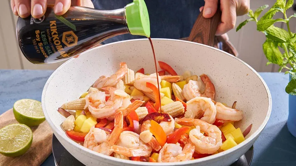 Ein farbenfrohes Wok-Gericht mit Garnelen, Mango und Limette, verfeinert mit der intensiven Umami-Note von Kikkoman salzreduzierter Sojasauce – jeder Bissen eine perfekte Balance aus Frische und reichen Aromen.