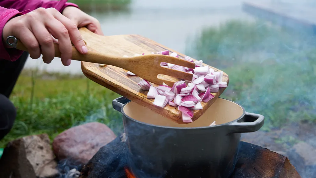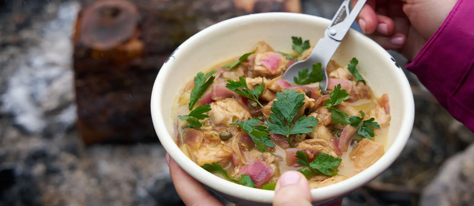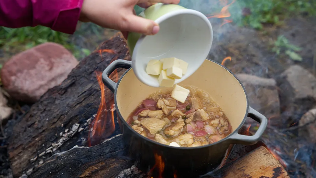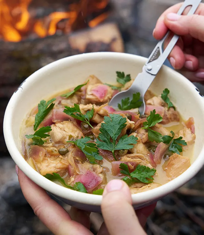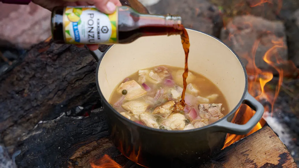 Saftiges Hendl, geschmort mit Kapern in Kikkoman Ponzu Zitrone, für eine frische Zitrusnote. Ein aromatisches Gericht, perfekt fürs entspannte Kochen am Lagerfeuer.