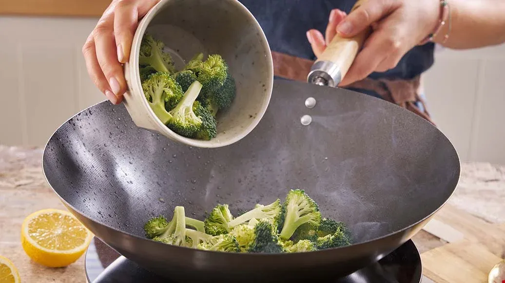 Öl in denselben Wok geben, Knoblauch und Brokkoli 1–2 Minuten darin anbraten. Wasser hinzufügen und Brokkoli bei mittlerer Hitze dämpfen, bis er weich ist. Paprika hinzufügen und alles weitere 2–3 Minuten garen.