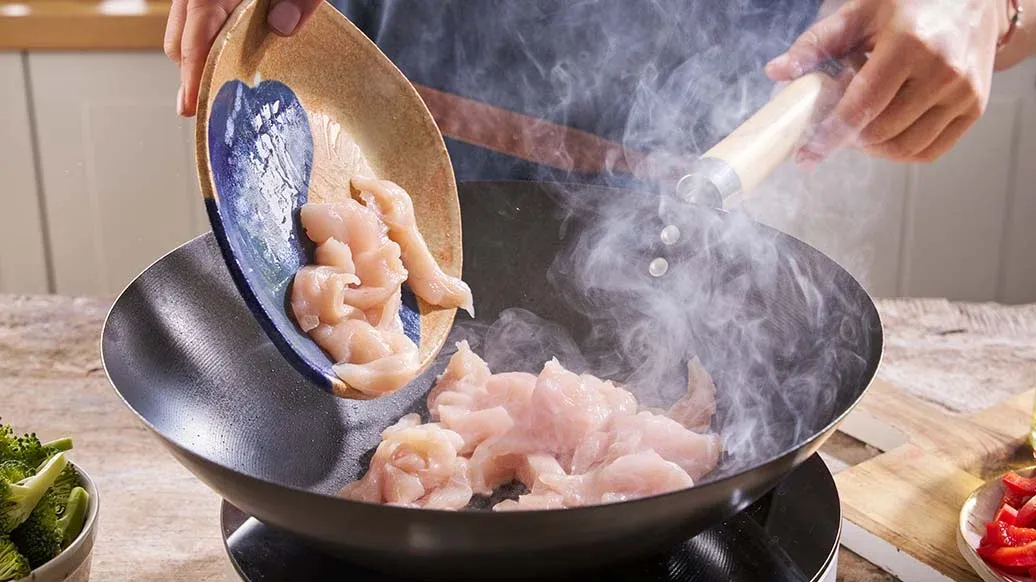 Öl im Wok erhitzen und Hühnerfleisch 3–4 Minuten goldbraun anbraten. Herausnehmen und beiseitestellen.