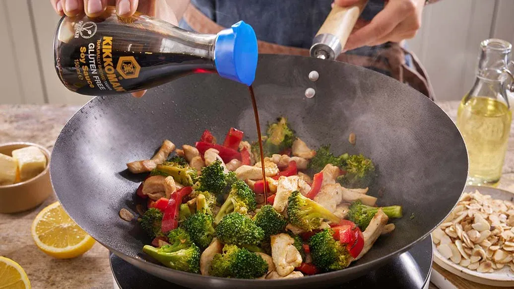 Das Hühnerfleisch wieder in den Wok geben, Kikkoman glutenfreie Sojasauce und Zitronensaft hinzufügen. Gut umrühren und 1–2 Minuten erhitzen. Vom Herd nehmen, Butter hinzufügen und umrühren, bis sie geschmolzen ist und die Sauce emulgiert. Mit den Mandelblättchen garnieren und servieren.