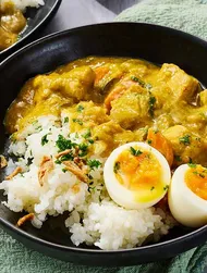 Zwiebel und Chilischote hacken und zusammen mit der Currypaste in Öl anbraten. Die passierten Tomaten dazugeben und 10 Minuten köcheln. Anschließend die Kokosmilch und die Kikkoman Ponzu Sojasauce Zitrone einrühren.