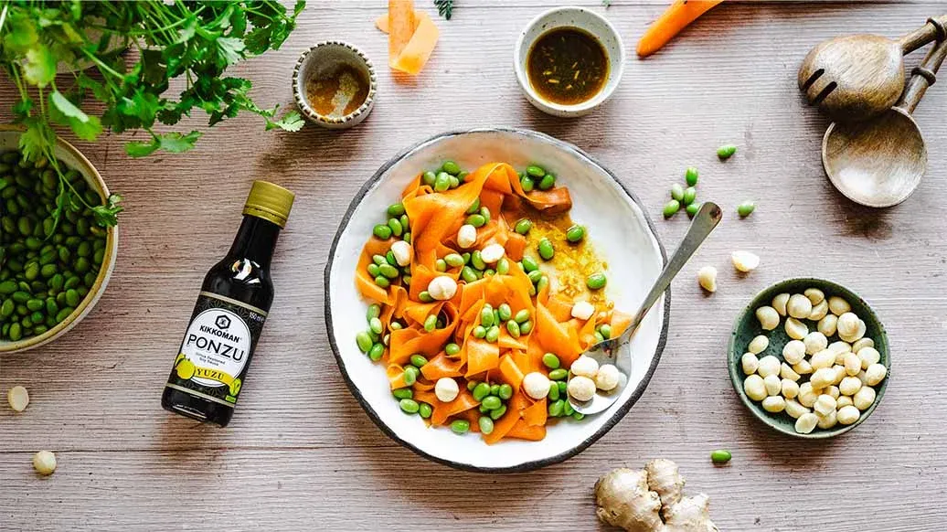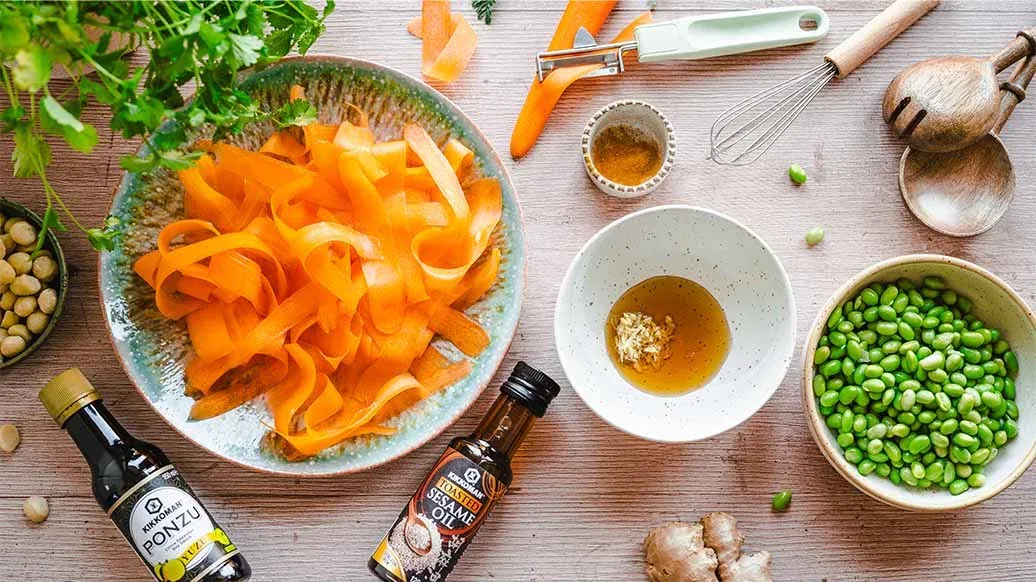 5 große Karotten – 3 EL Kikkoman Ponzu - Würzsauce mit Sojasauce und Essig, mit Yuzusaft – 2 EL Kikkoman geröstetes Sesamöl – ½ TL Kurkumapulver – 1 TL geriebener Ingwer