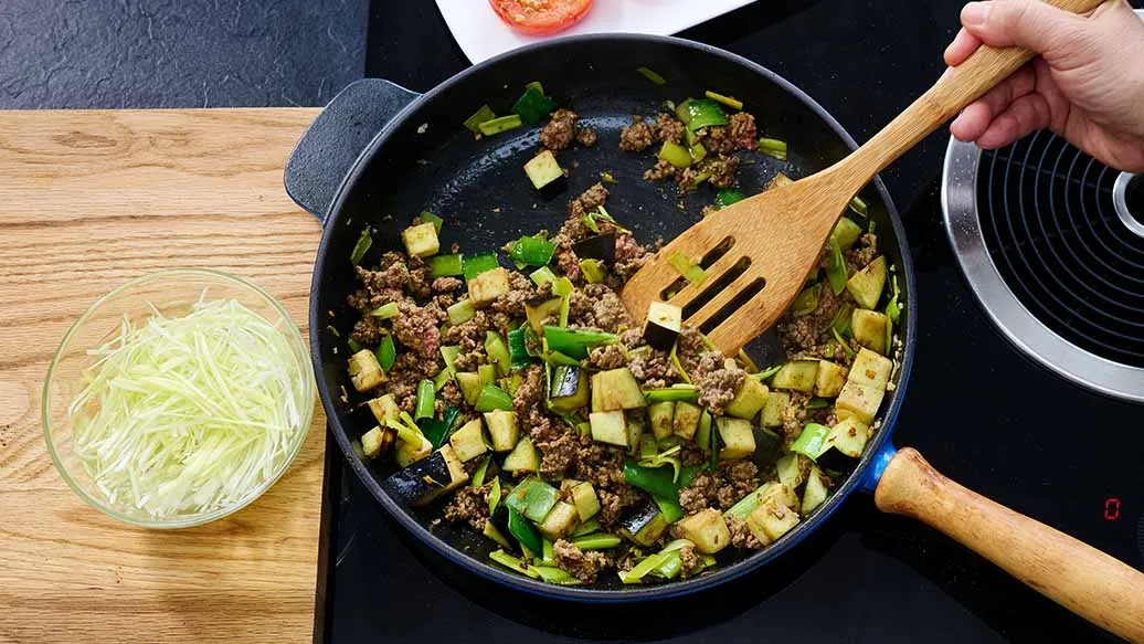 Rapsöl in einer Pfanne auf niedriger Stufe erhitzen. Den Knoblauch und Ingwer zusammen mit Kreuzkümmelsamen leicht anbraten, bis es duftet. Die Tomatenhälften mit der Schnittfläche nach unten an einer freien Stelle in der Pfanne grillen, bis sie leicht gebräunt sind. Den in Stücke geschnittenen Lauch und Currypulver hinzufügen und kurz anbraten. Die Tomaten wenden, sobald sie etwas weich geworden sind, aus der Pfanne nehmen und beiseitestellen. Faschiertes hinzuzufügen und leicht anbraten. Die Melanzaniwürfel und Wasser in die Pfanne geben, abdecken und bei geringer Hitze ca. 15 Minuten köcheln lassen.