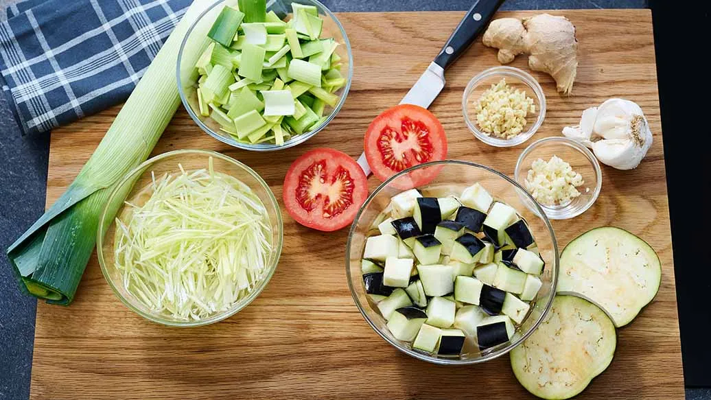 Knoblauch und Ingwer fein hacken. 5 cm vom weißen Teil des Lauchs für die Garnitur längs fein schneiden. Den restlichen Lauch in kleine Stücke schneiden. Melanzani in 1 cm große Würfel schneiden und etwa 10 Minuten in Salzwasser (500 ml Wasser mit 1 TL Salz) einweichen, dann gut abtropfen lassen. Die Tomate horizontal halbieren.