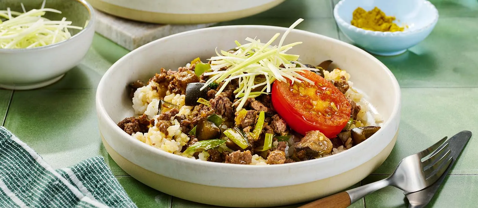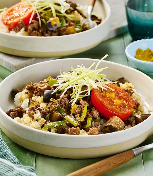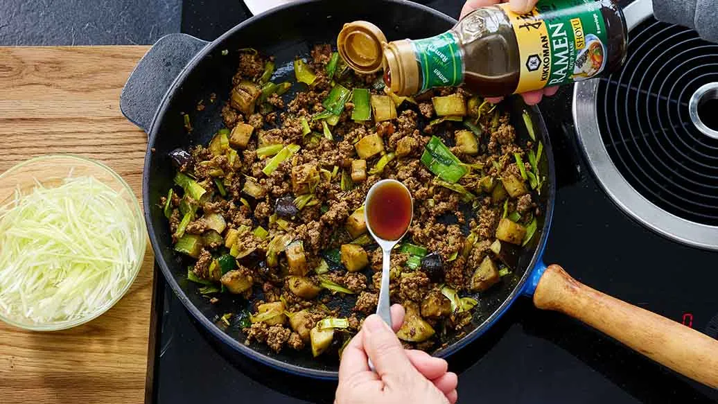 Dieses japanische Curry verwendet Lauch statt Zwiebeln. Die Melanzani nehmen das Umami des Faschierten, der Kikkoman Sojasauce und der Kikkoman Ramen Suppenbasis auf. Frische Tomaten und roher Lauch sorgen für Knackigkeit und Ausgewogenheit.