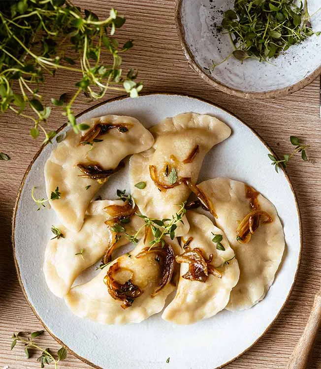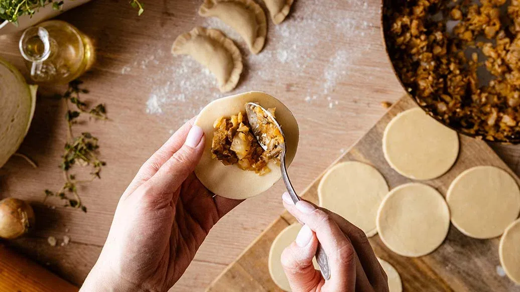 Den Teig in drei Portionen teilen. Eine Portion zu einem dünnen Teigblatt ausrollen, die beiden anderen Portionen dabei abgedeckt halten, damit sie nicht austrocknen. Aus dem Teig Kreise ausstechen. 1 TL Füllung in die Mitte jedes Kreises geben, zu einem Halbmond falten und die Ränder festdrücken. Die Teigtaschen auf ein bemehltes Brett legen und mit einem Tuch abdecken. Arbeitsschritte für die restlichen Teigportionen wiederholen. Die Teigmenge sollte etwa 15 bis 20 Teigtaschen ergeben. Die fertigen Teigtaschen portionsweise in kochendem Salzwasser garen.