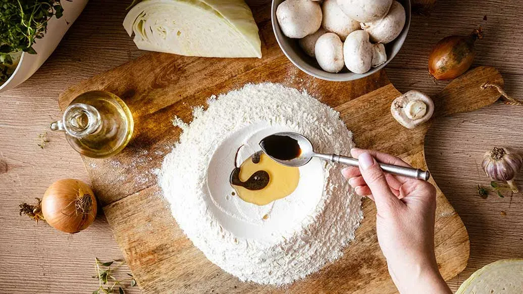 Mehl auf eine Arbeitsfläche geben und in der Mitte eine Mulde formen. Öl, Kikkoman Sojasauce und heißes Wasser hinzufügen. Vermengen und kneten, bis der Teig glatt und elastisch ist. Den Teig mit einer Schüssel abdecken und etwa 20 Minuten ruhen lassen.