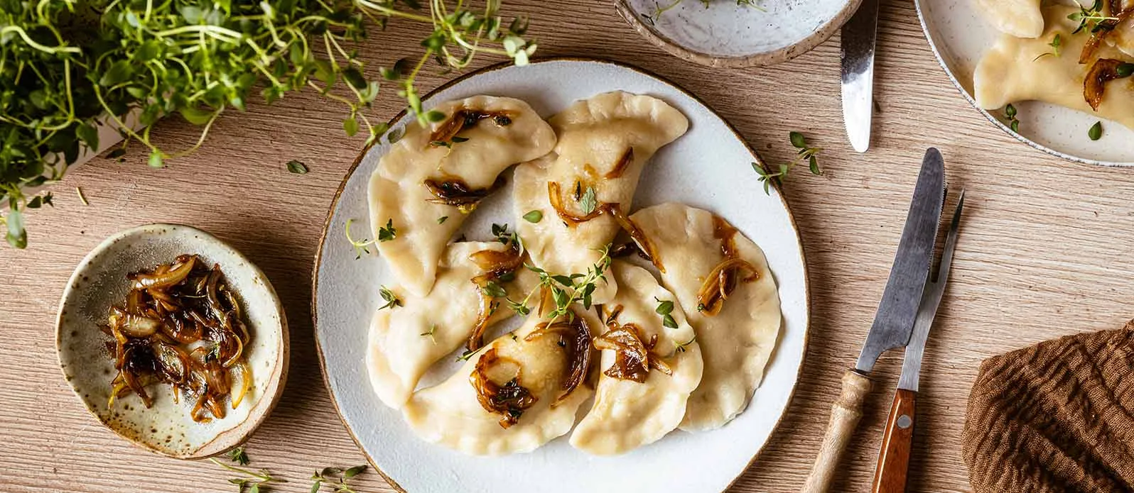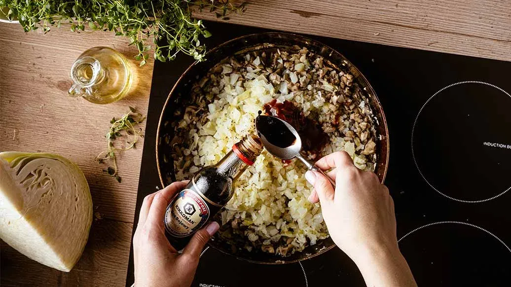 Handgemachte Teigtaschen, gefüllt mit Weißkraut, Pilzen und Zwiebeln. Kikkoman Sojasauce und Kikkoman Chilisauce Kimchi verleihen diesem einfachen Gericht eine Umami-reiche Tiefe und milde Schärfe. Wohltuend-wärmende Hausmannskost!