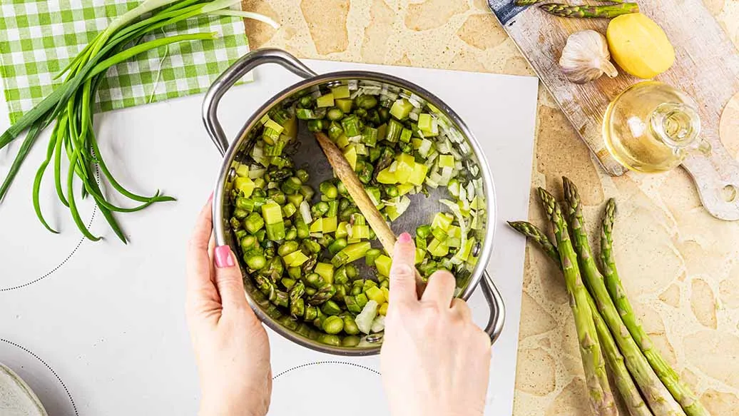 Den Spargel waschen und die holzigen Enden abbrechen. Die Spitzen von drei Stangen abschneiden und beiseite legen. Den restlichen Spargel in ca. 1 cm große Stücke schneiden. Kartoffeln schälen und fein würfeln. Zwiebel fein hacken und Knoblauch zerdrücken. Olivenöl und Butter in einem Topf mit schwerem Boden erhitzen. Zwiebel, Knoblauch, Kartoffeln und geschnittenen Spargel hinzufügen. 1 Minute lang anbraten.