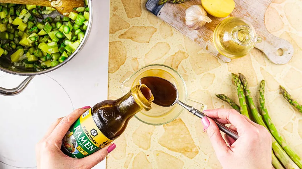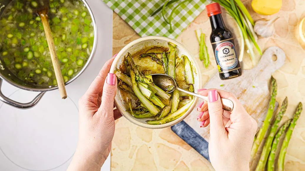 Während die Suppe kocht, die Spargelspitzen aus Schritt 1 vorbereiten, indem sie der Länge nach in dünne Streifen geschnitten werden. In einer kleinen Schüssel das Olivenöl, den Balsamico-Essig und die Kikkoman Sojasauce vermischen und die Spargelstreifen hinzugeben. Die Spargelstreifen 10 Minuten marinieren.