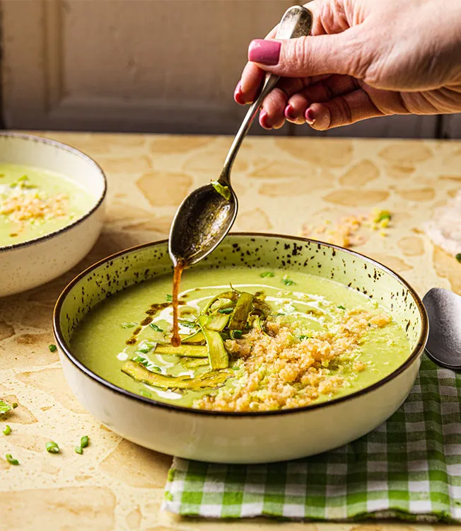 Knusprige Panko-Grünspargelcremesuppe