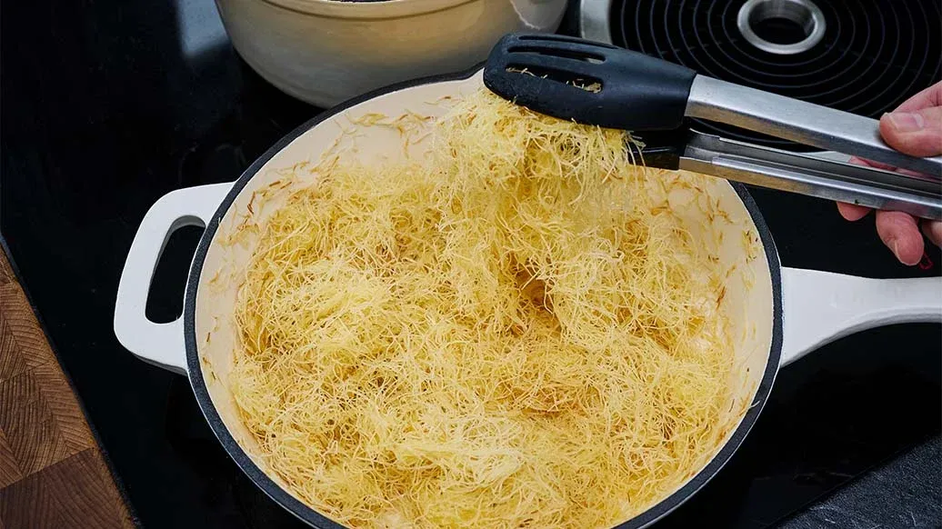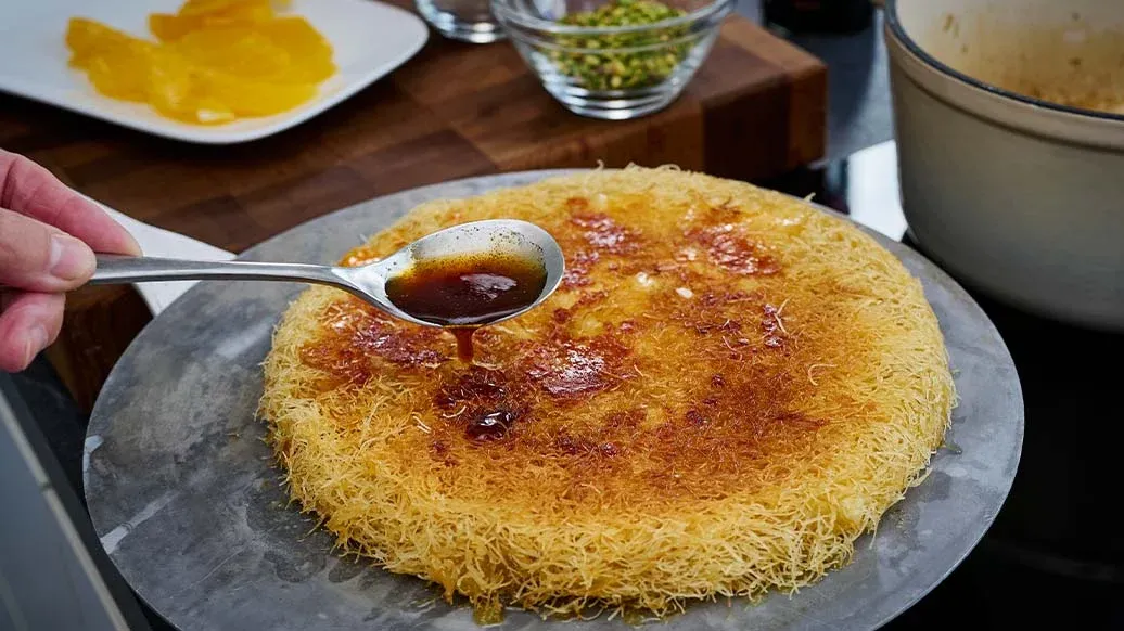 Eine Pfanne (22 cm Ø) oder 4 bis 8 Portionsförmchen mit reichlich Butter einfetten. Die Hälfte der Kadayif-Butter-Mischung in die Pfanne geben und gleichmäßig fest andrücken. Dil Peyniri darauf verteilen, dabei einen ca. 1 cm breiten Rand frei lassen. Die restliche Kadayif-Butter-Mischung darauf geben und gut andrücken, bis die Oberfläche fest ist und die Ränder „rund” sind. Die Pfanne bei niedriger bis mittlerer Temperatur erhitzen und Künefe 3 bis 5 Min. braten, bis die Unterseite goldbraun ist. Wenden (z. B. mithilfe einer Tortenplatte oder eines großen Tellers) und weitere 2 bis 4 Min. braten.