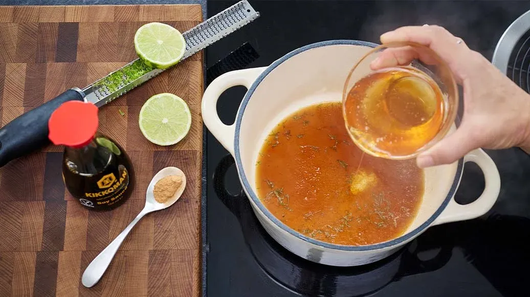 Etwas Limettenschale abreiben, Limette halbieren und Saft auspressen. Limettenabrieb und -saft mit Honig, Kikkoman Sojasauce, Zimt und 75 ml Wasser in einem kleinen Topf 3 bis 5 Min. köcheln lassen. Optional: Rosenwasser zufügen.