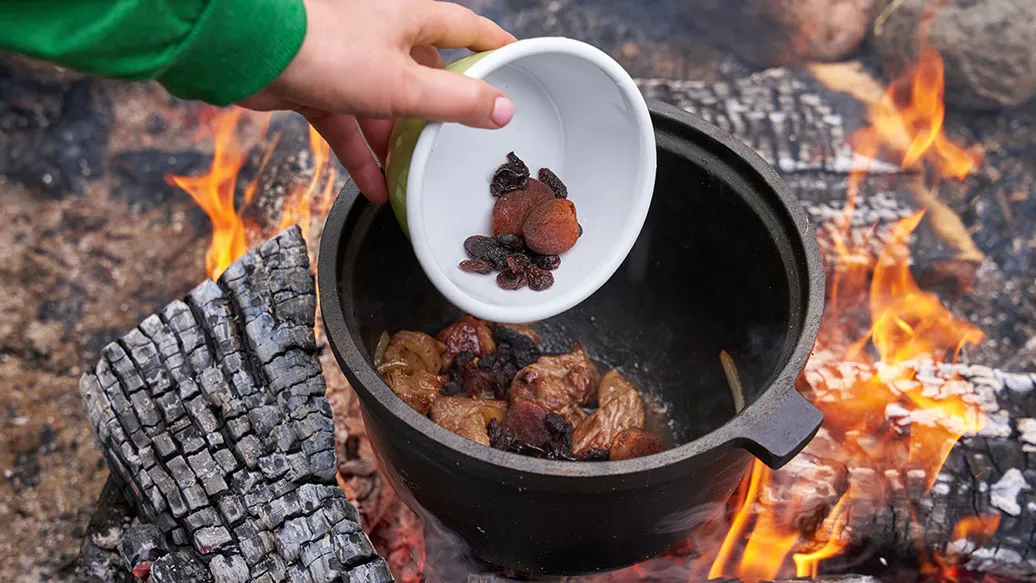 360 g Lammschulter, gewürfelt – 100 g Zwiebel, in dünnen Spalten – 400 ml Wasser oder Gemüsebrühe – 20 ml Rapsöl – 2 Prisen gemahlener Zimt – 2 Prisen gemahlener Kreuzkümmel – 40 g getrocknete Aprikosen – 40 g Backpflaumen – 40 g Rosinen