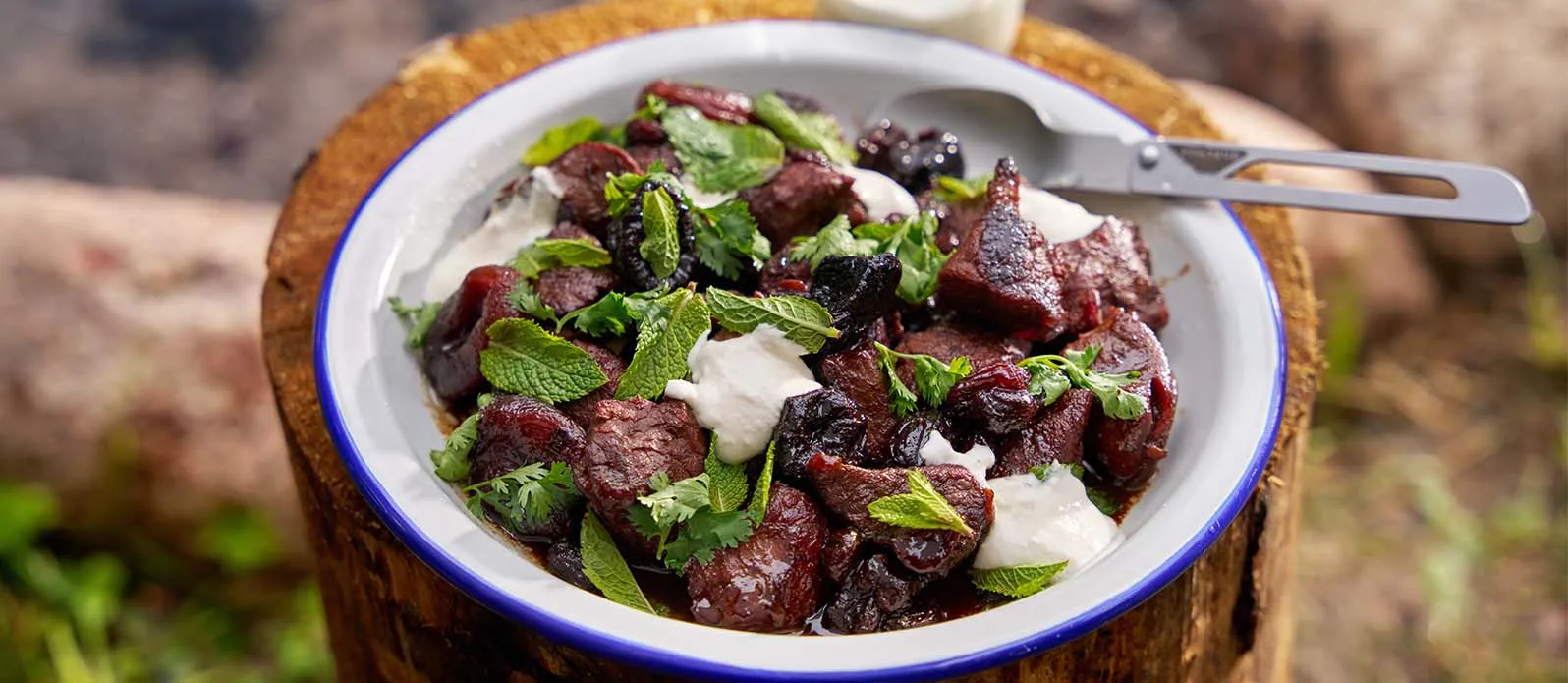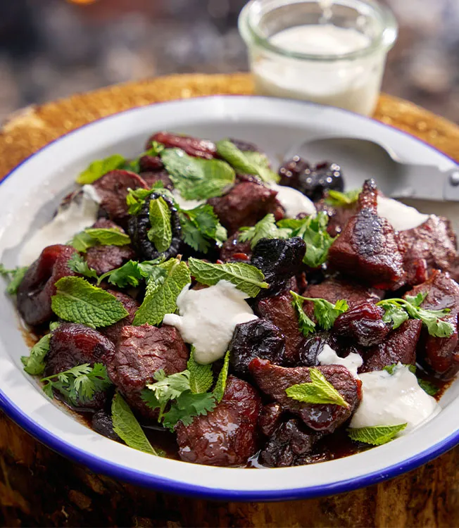 Zartes Lammfleisch, geschmort mit getrockneten Marillen, Backpflaumen und Rosinen, verfeinert mit Kikkoman Ponzu Yuzu und serviert mit cremigem Joghurt.