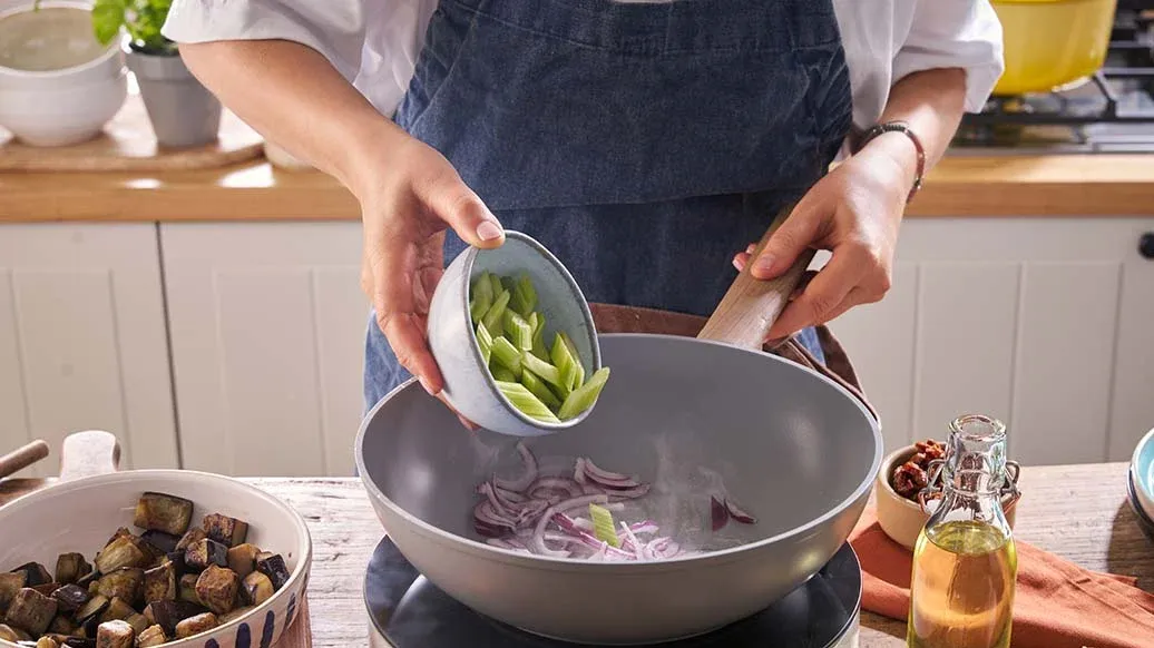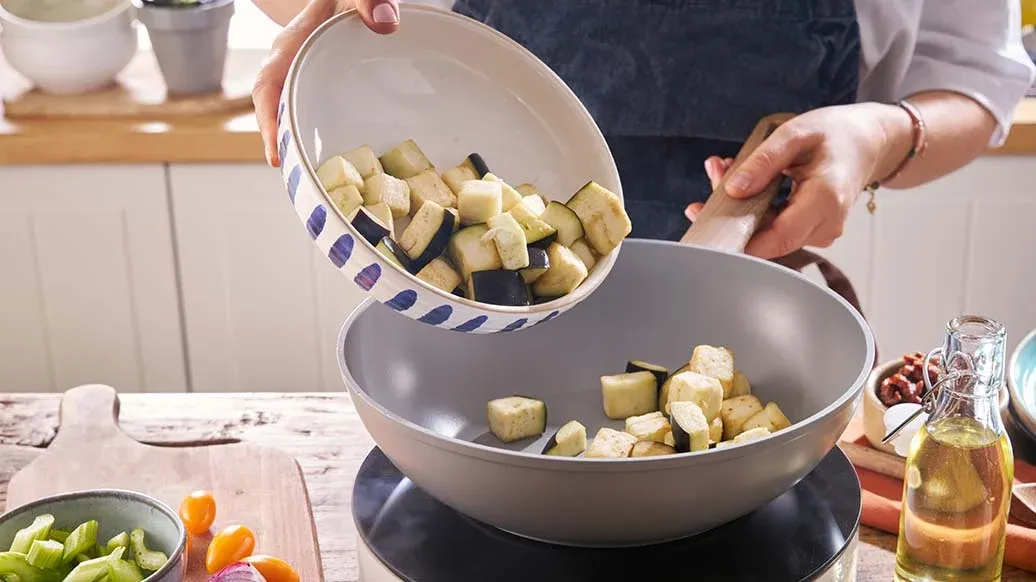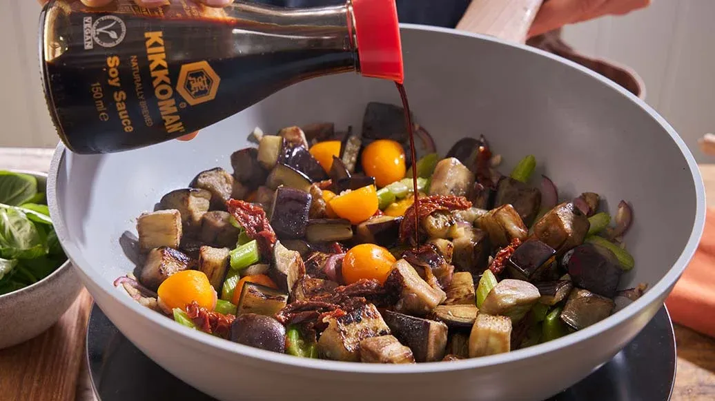 Ein farbenfrohes Wok-Gericht voller mediterraner Aromen – rauchige Melanzani, süße sonnengetrocknete Tomaten und aromatisches Basilikum, abgerundet mit dem intensiven Umami-Geschmack von Kikkoman Sojasauce.