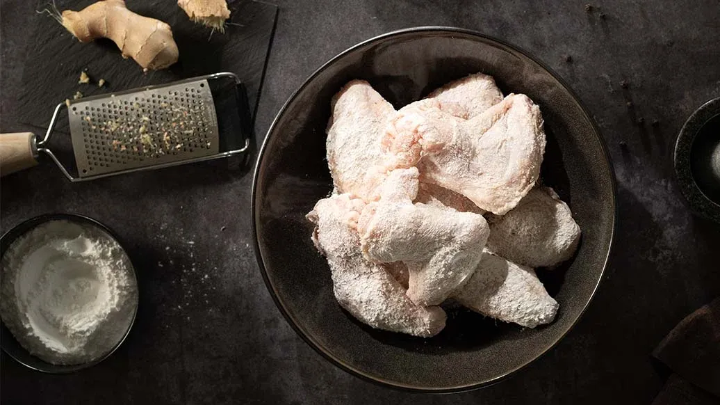 750 g Chicken Wings – 2 Prisen Pfeffer, frisch gemahlen – 3 EL Ingwer, fein gehackt – 150 g Maisstärke – 2 TL Backpulver