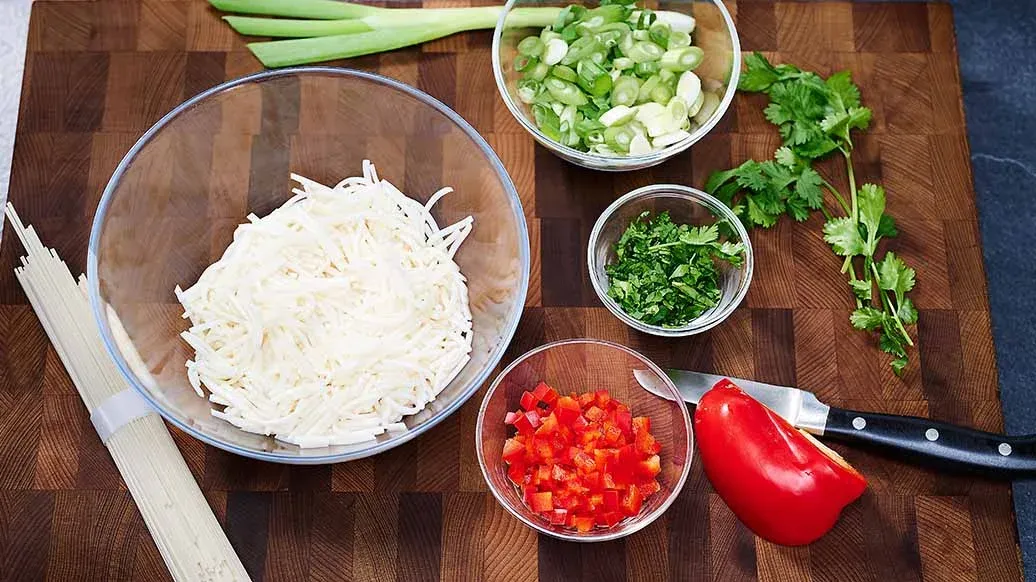 Nudeln nach Packungsanweisung zubereiten und in kleine Stücke schneiden. Frühlingszwiebeln in Ringe und Paprika in kleine Würfel schneiden, Koriander fein hacken.