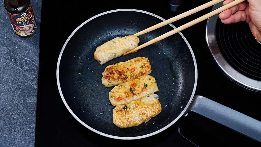 Kikkoman Sesamöl in einer großen Pfanne erhitzen und die Teigtaschen von allen Seiten 4–6 Minuten goldbraun braten.