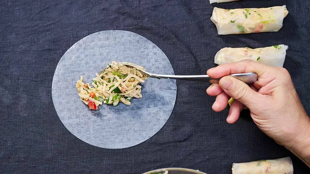 Reispapierblätter einzeln in einer Schüssel mit kaltem Wasser befeuchten und auf nasse Küchentücher legen. Je ca. 1 EL Füllung auf ein Reispapierblatt geben, an beiden Seiten einklappen und einrollen.