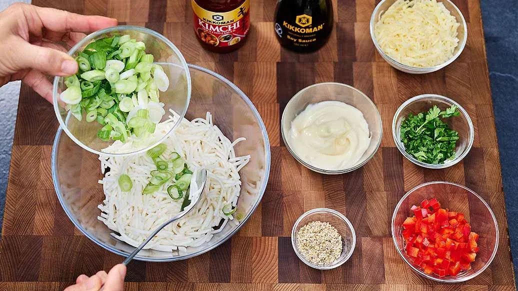 Die Nudeln, 2/3 der Frühlingszwiebeln, den Koriander, die Paprika, Sesam, Kikkoman Chilisauce Kimchi, Mayonnaise, Käse und Kikkoman Sojasauce vermischen.