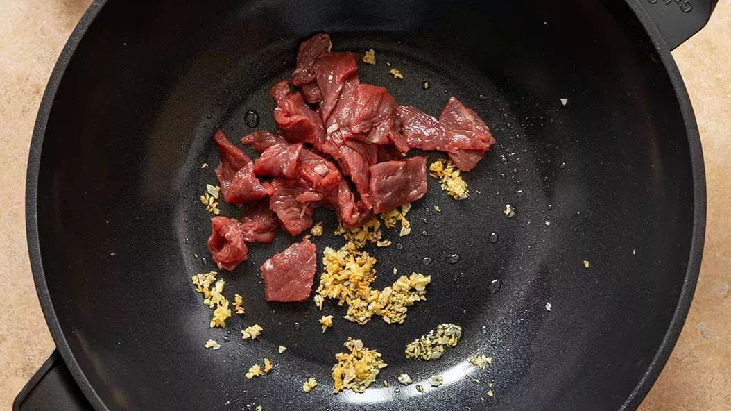 Öl im Wok erhitzen, Ingwer und Knoblauch kurz darin anbraten, dann das Fleisch zugeben und kurz anbraten.