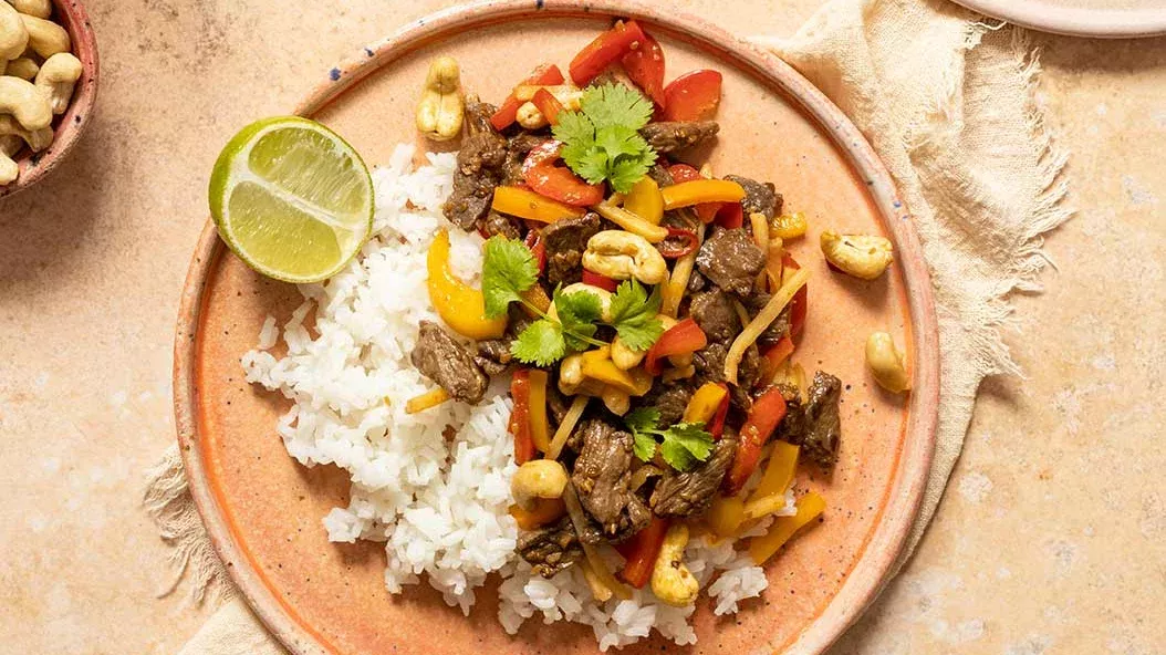 Rindfleisch mit Teriyaki-Sauce, Nüssen und Jasminreis
