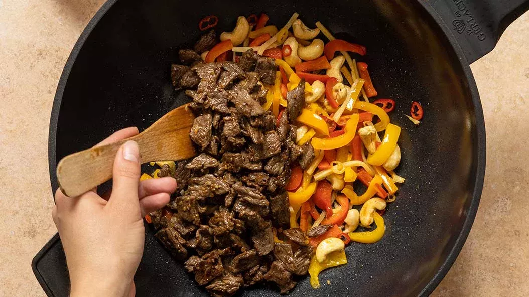 Das Rindfleisch wieder hinzufügen, alles gut mischen und zuletzt den Wok vom Herd nehmen.