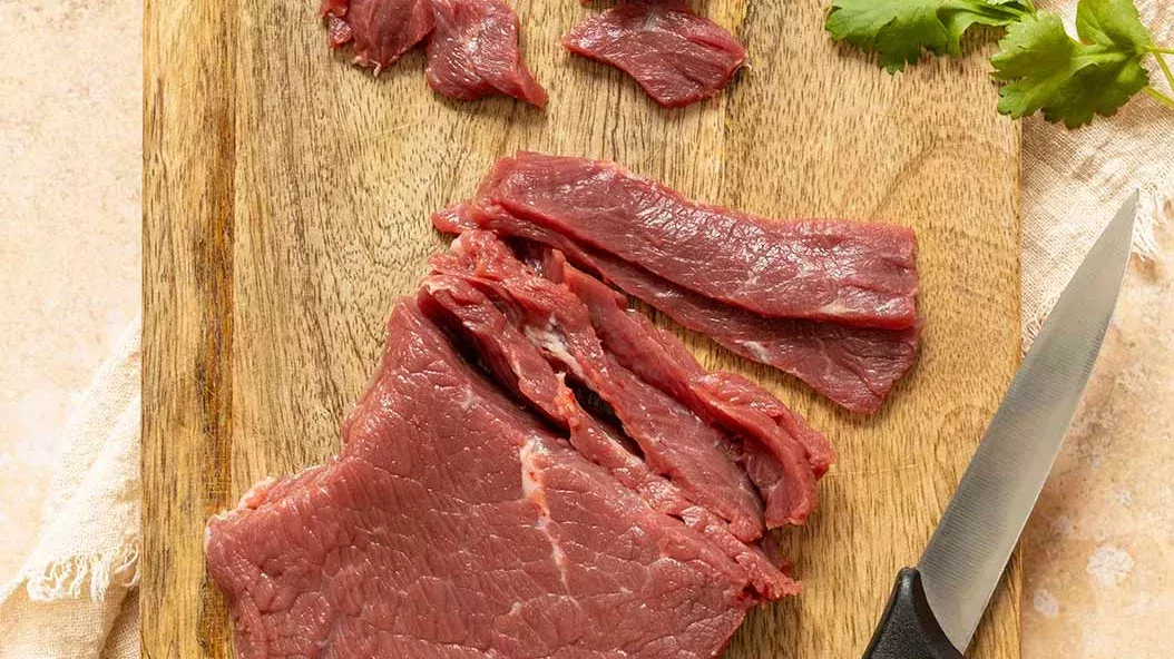 Das Rindfleisch in sehr dünne Scheiben und dann in kleinere Stücke schneiden.