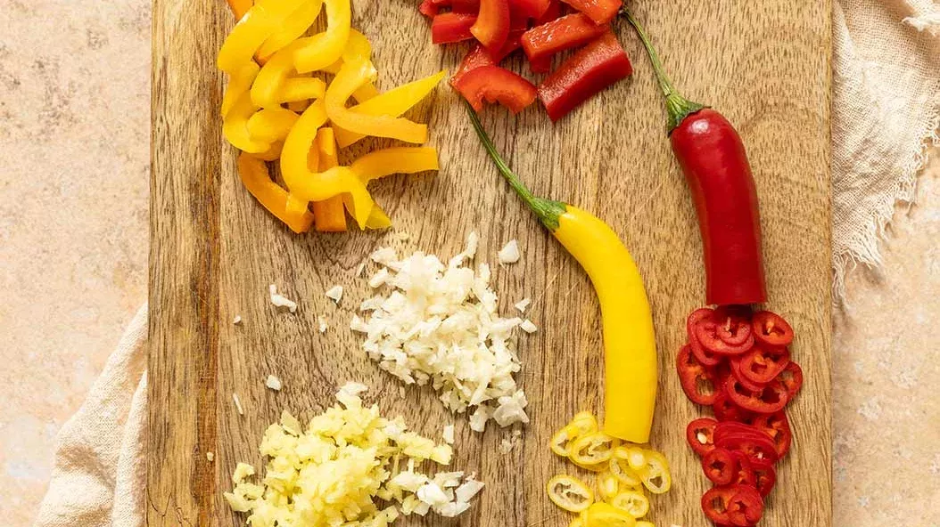1 Stück frischer Ingwer (ca. 5 g) – 1 Knoblauchzehe – ½ rote Paprika – ½ gelbe Paprika – ½ TL gelbe Chilischote (ca. 7 g) – ½ TL rote Chilischote (ca. 7 g)