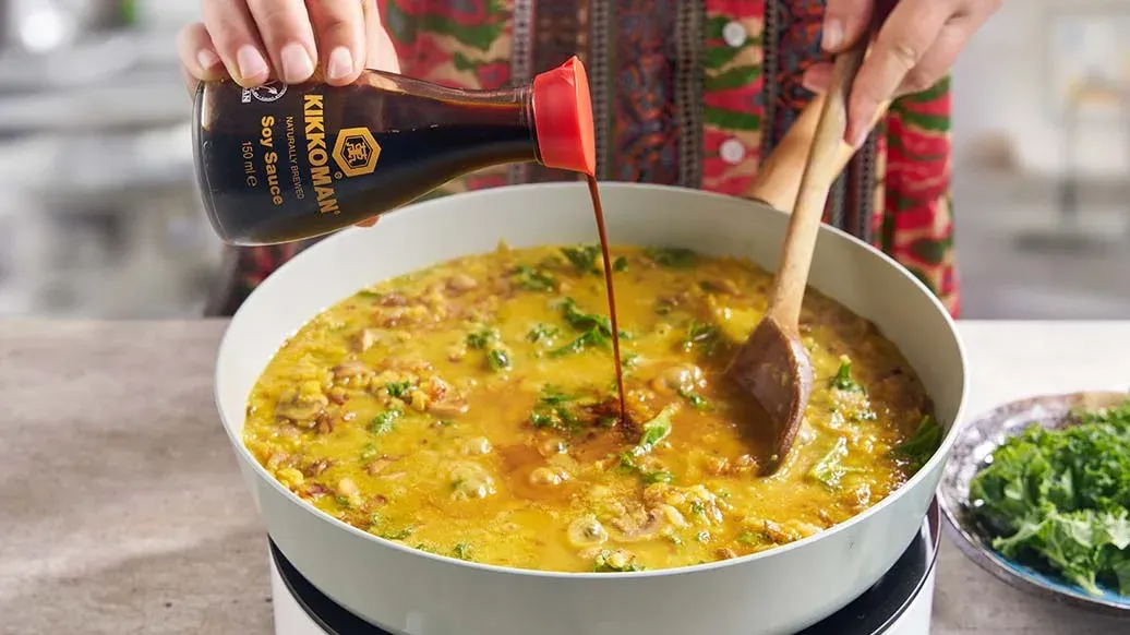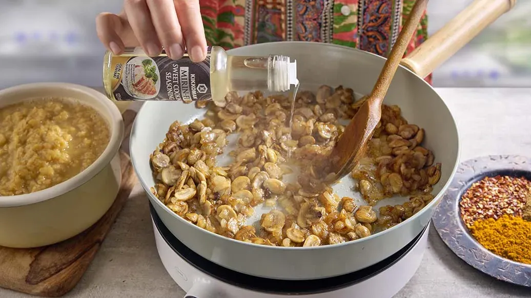 Linsen 10 Minuten in Gemüsebrühe kochen. Zwiebel und Champignons 10 Minuten in Ghee goldbraun karamellisieren, dann Kikkoman süße Würzsauce Mirin-Art hinzufügen und 1 Minute anbraten. Kreuzkümmel, Kurkuma und Chiliflocken zugeben und 10 Sekunden rösten, damit sich die Aromen entfalten können. Die Linsen unterrühren und 5 Minuten kochen.