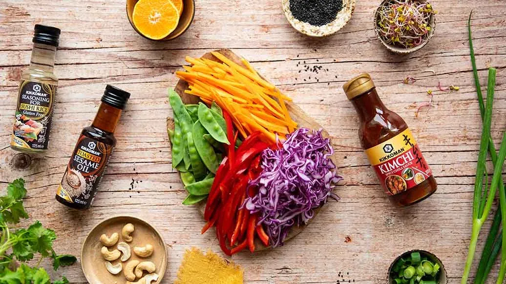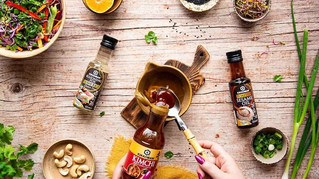 1 EL Kikkoman scharfe Chilisauce für Kimchi – 1 EL frisch gepresster Mandarinensaft – 1 EL Erdnussbutter – 1 EL Kikkoman geröstetes Sesamöl – 1 TL Ahornsirup – 1 TL Kikkoman Würzmittel für Sushi-Reis (125ml) – ½ EL Wasser – 20 g Cashewkerne – 2 TL schwarzer Sesam