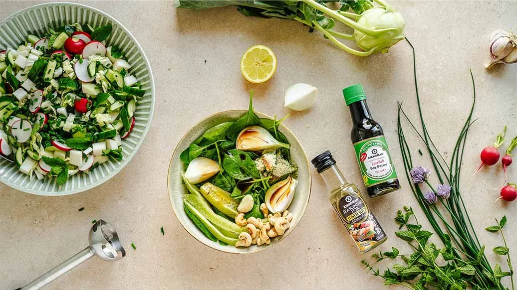 Spinat, Zwiebel, Knoblauch und die Gurkenkerne mit Olivenöl, Kikkoman Sojasauce mit weniger Salz, Kikkoman Würzmittel für Sushi-Reis, Zitronensaft, Hefeflocken und Cashews zu einer glatten Sauce pürieren. Das Dressing über das Gemüse geben und gut vermischen. Fertig!